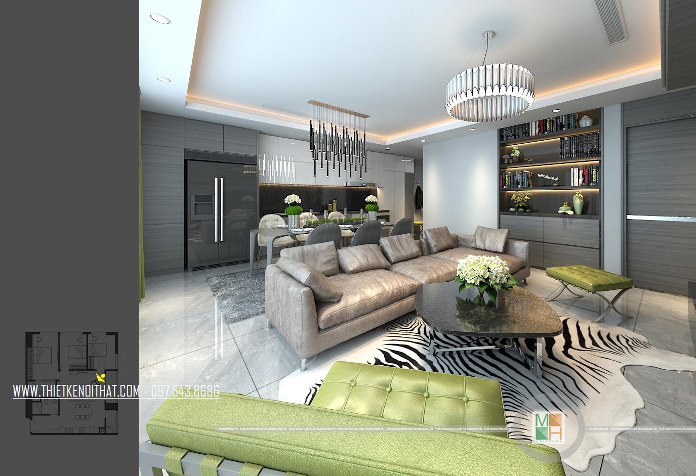 Thấm nhuần tư tưởng xuên suốt của khu chung cư cao cấp này các kiến trúc sư Morehome đã thiết kế căn hộ mẫu chung cư Imperia Garden theo phong cách hiện đại pha một chút tân cổ điển nhẹ nhàng mang “vườn” vào từng không gian sống. Bắt đầu từ phòng khách là một không gian sinh hoạt chung với bộ sofa bọc da sang trọng thêm vào đó điểm nhấn cá tính từ tấm thảm trải sàn da thú cá tính. Không những thế phòng khách còn ấn tượng bởi những chiếc ghế màu xanh lá và hệ thống đèn trang trí hiện đại đầy phá cách. Đặc biệt các kiến trúc sư đã tinh tế khi thiết kế không sử dụng lặp lại cùng một loại đèn trang trí trong không gian sinh hoạt chung này. Vừa đa dạng, vừa tạo điểm nhấn cho không gian nhỏ như bếp nấu, bàn ăn … mà cũng không bị rối mắt. Đó được gọi là nghệ thuật sắp đặt