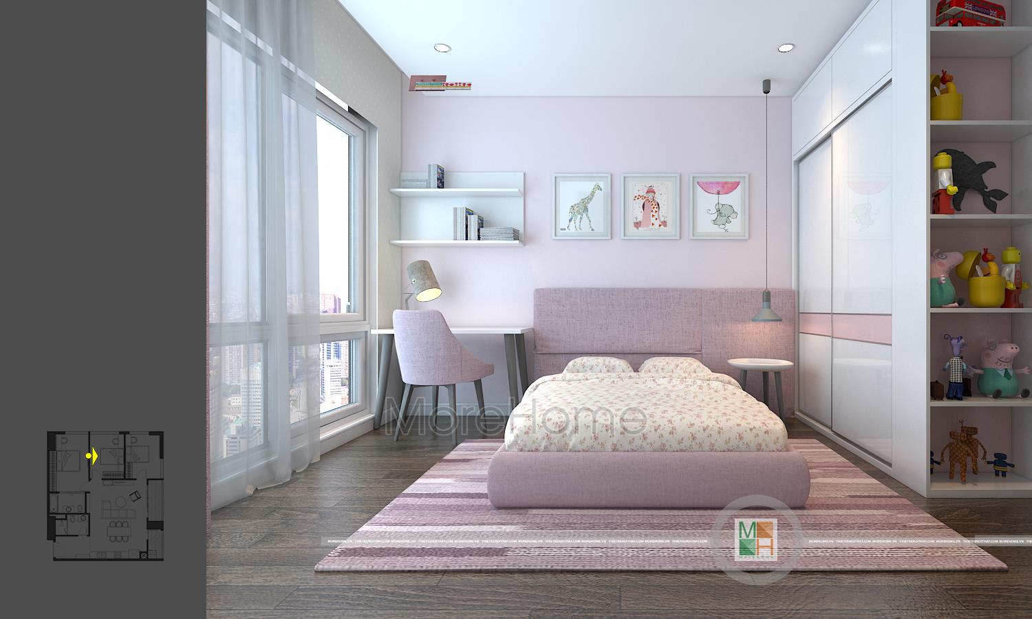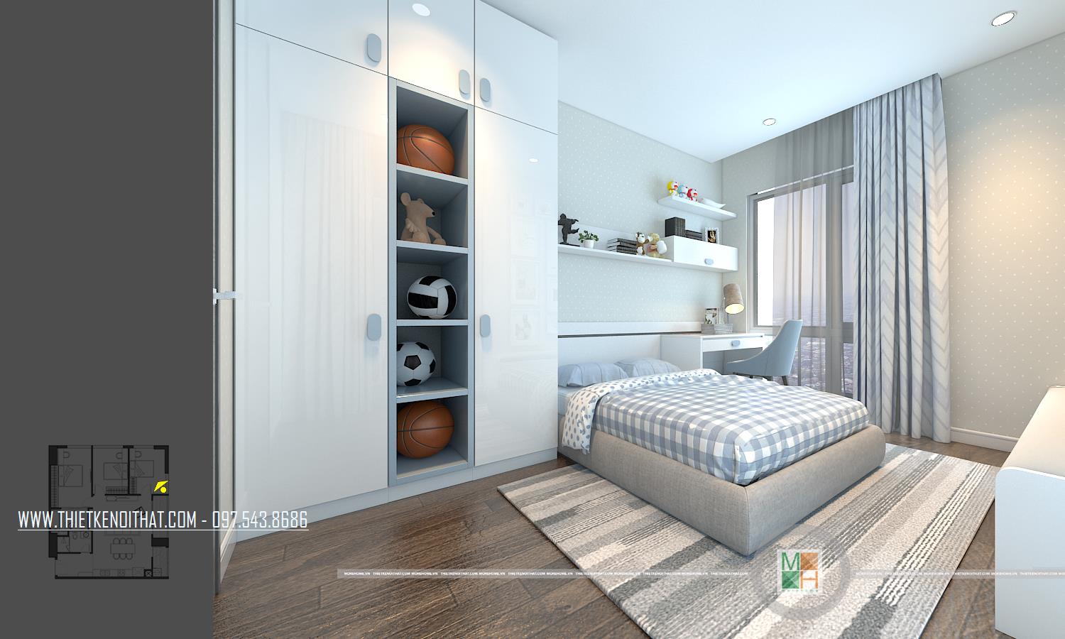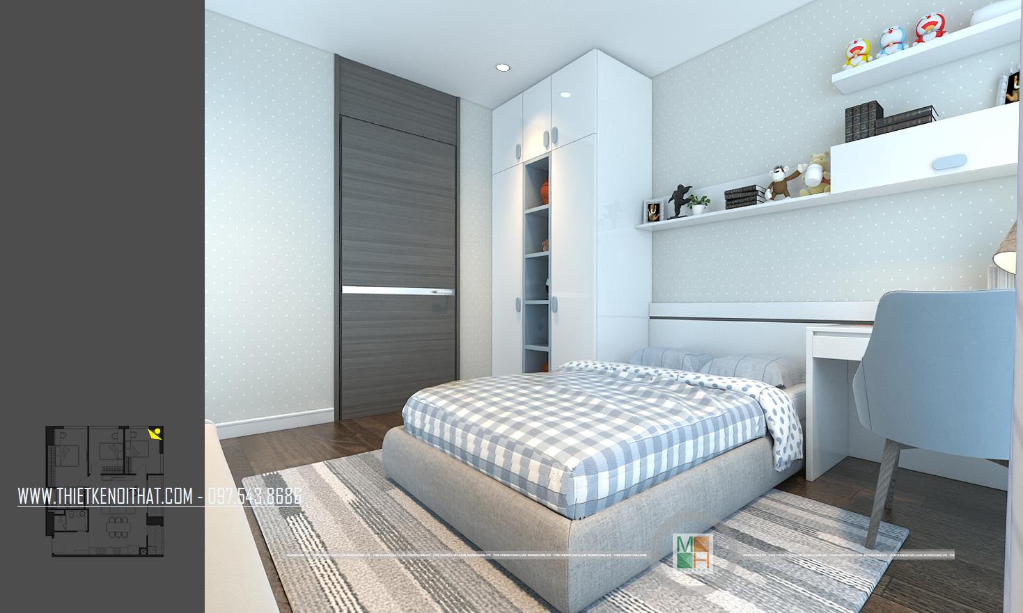 Thiết kế nội thất phòng ngủ trẻ em với 2 phòng, một phòng ngủ bé trai với tông màu xanh nhẹ nhàng và một phòng ngủ bé gái với tông màu hồng đáng yêu. Phòng ngủ bé trai có diện tích rộng hơn nên được bố trí thêm một chiếc kệ tủ trang trí, bàn học của 2 bé đều được đặt cạnh cửa sổ tạo môi trường tốt nhất cho các bé học tập.