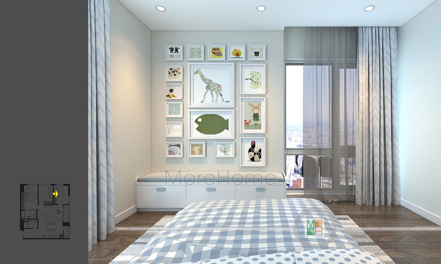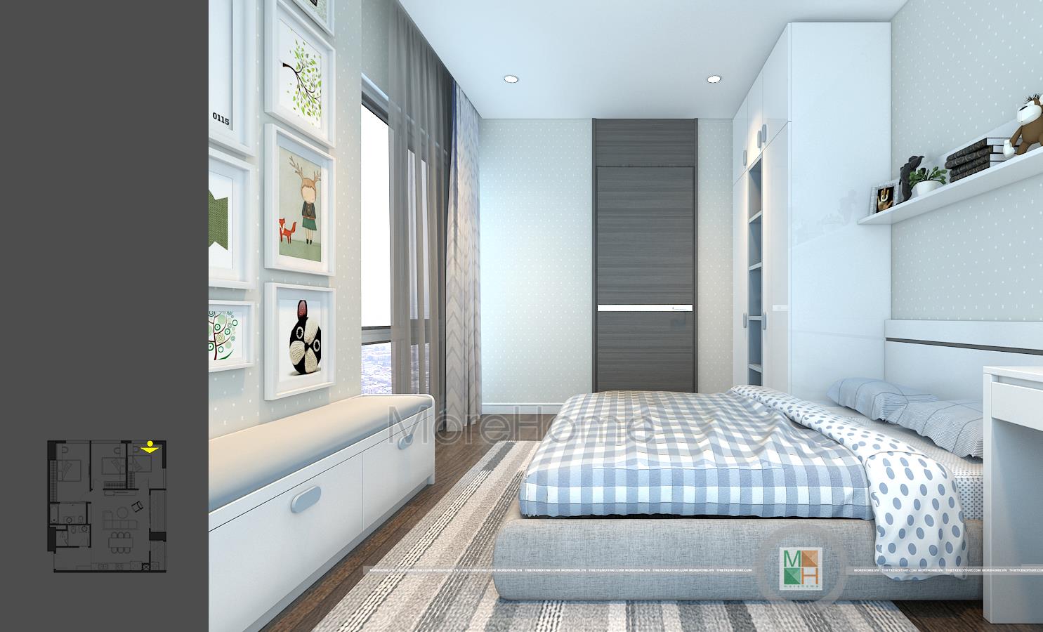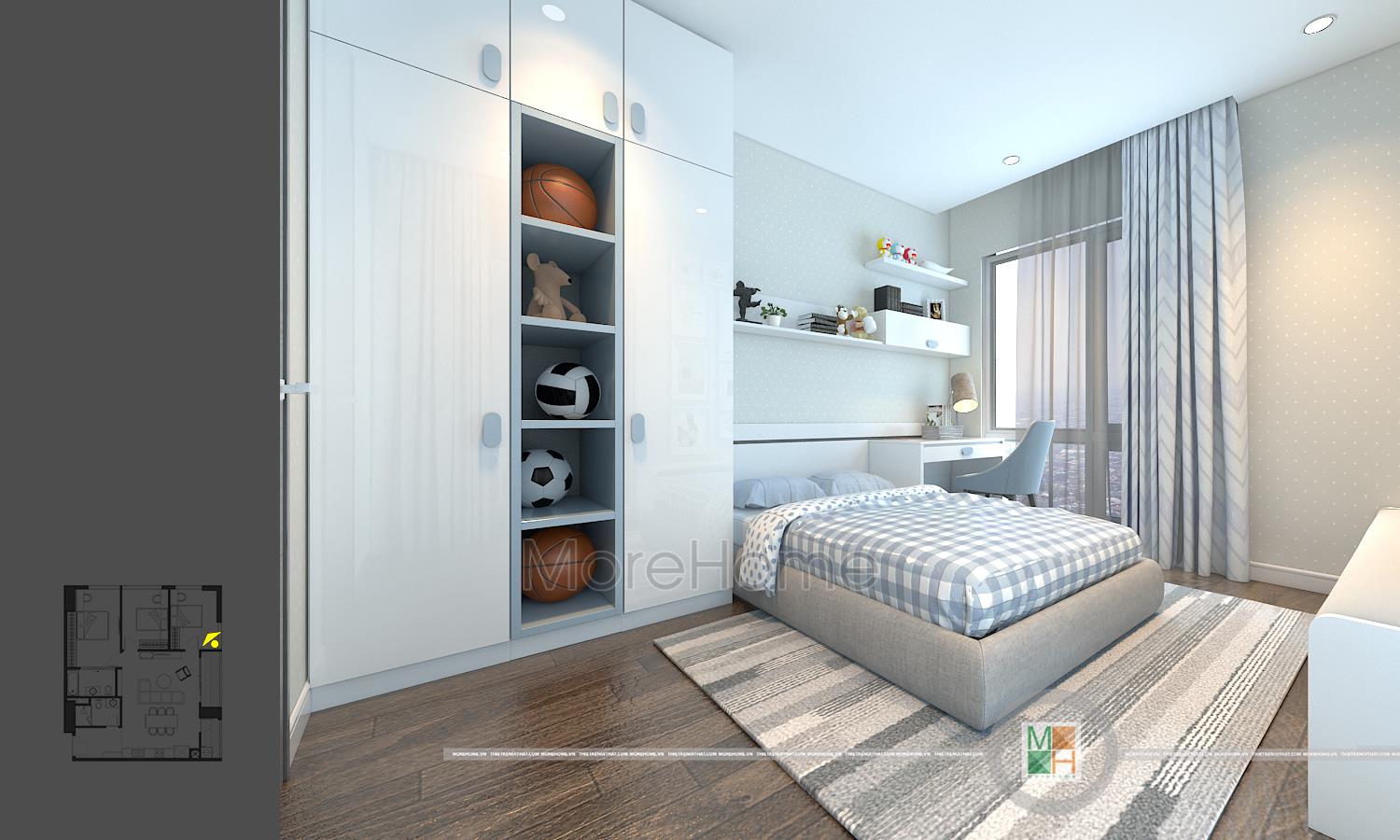 Thiết kế nội thất phòng ngủ trẻ em với 2 phòng, một phòng ngủ bé trai với tông màu xanh nhẹ nhàng và một phòng ngủ bé gái với tông màu hồng đáng yêu. Phòng ngủ bé trai có diện tích rộng hơn nên được bố trí thêm một chiếc kệ tủ trang trí, bàn học của 2 bé đều được đặt cạnh cửa sổ tạo môi trường tốt nhất cho các bé học tập.