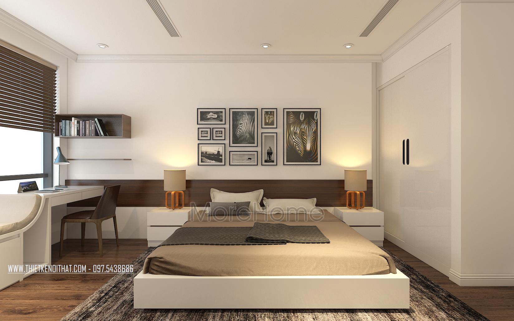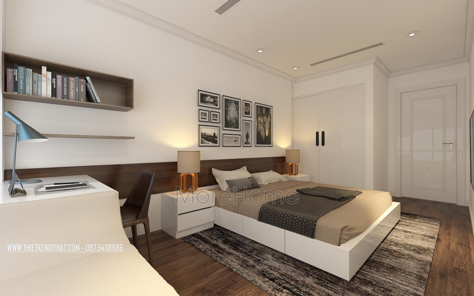Cuối cùng là thiết kế nội thất phòng ngủ hiện đại, tone màu ghi xám, nâu ấm hay trắng vẫn là các tone màu được kiến trúc sư ưu ái sử dụng. Điểm nhấn đặc biệt ở không gian này có lẽ chính là thiết kế kết hợp khéo léo giữa tủ gỗ, kệ, và giá để đồ, với sự kết hợp khéo léo như vậy, kiến trúc sư dễ dàng điều phối không gian, vừa đảm bảo tính thẩm mỹ vừa giúp tiết kiệm không gian cho gia chủ. Ánh sáng tự nhiên cũng được tận dụng từ khung cửa sổ kính cường lực trong suốt giúp mang lại hứng khởi và sự tươi mới cho không gian.