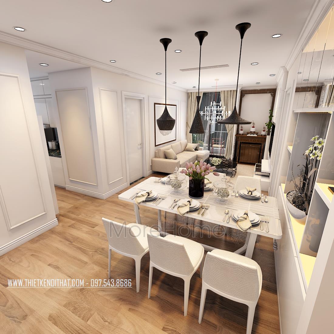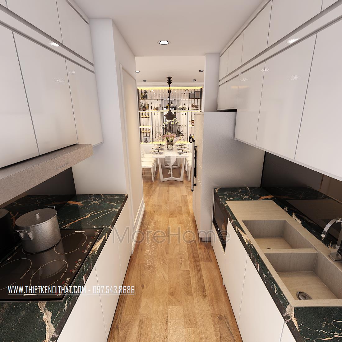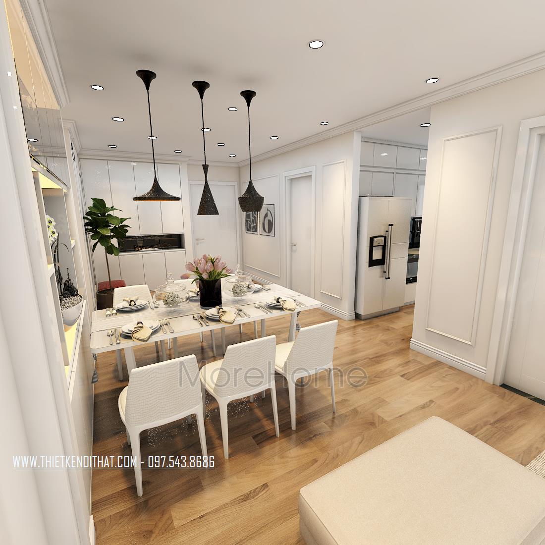 Tiếp theo là thiết kế nội thất căn bếp hiện đại. Tone màu trắng nhẹ nhàng vẫn là điểm nhấn màu sắc tạo sự thống nhất cho không gian sống. Bộ bàn ghế không quá rộng, phù hợp với các gia đình nhỏ hay các bữa tiệc sinh hoạt gia đình đầm ấm. Kệ tủ đa ngăn được sử dụng giúp đảm bảo tính công năng của căn hộ. Một vài điểm nhấn thẩm mỹ như đèn trang trí, lọ hoa, gương phản chiếu, được sử dụng giúp không gian trở nên cuốn hút hơn.