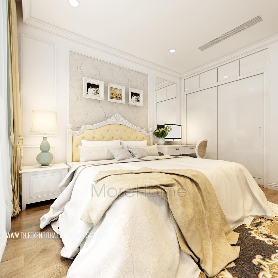 Căn phòng ngủ tân cổ điển sử dụng tone màu vàng nhẹ làm chủ đạo mang lại cảm giác dễ chịu cho gia chủ. Các hoa văn trang trí trên giường ngủ, kệ, tủ được thêm để tạo điểm nhấn tân cổ điển cho thiết kế. Ánh sáng tự nhiên không chỉ được lấy từ khung cửa rộng, mà hơn cả, cách bố trí phòng với gương phản chiếu, và màu sắc sáng, nhẹ cũng góp phần lớn tạo hiệu ứng cho không gian, mang đến cảm giác cơi nới cho căn phòng.