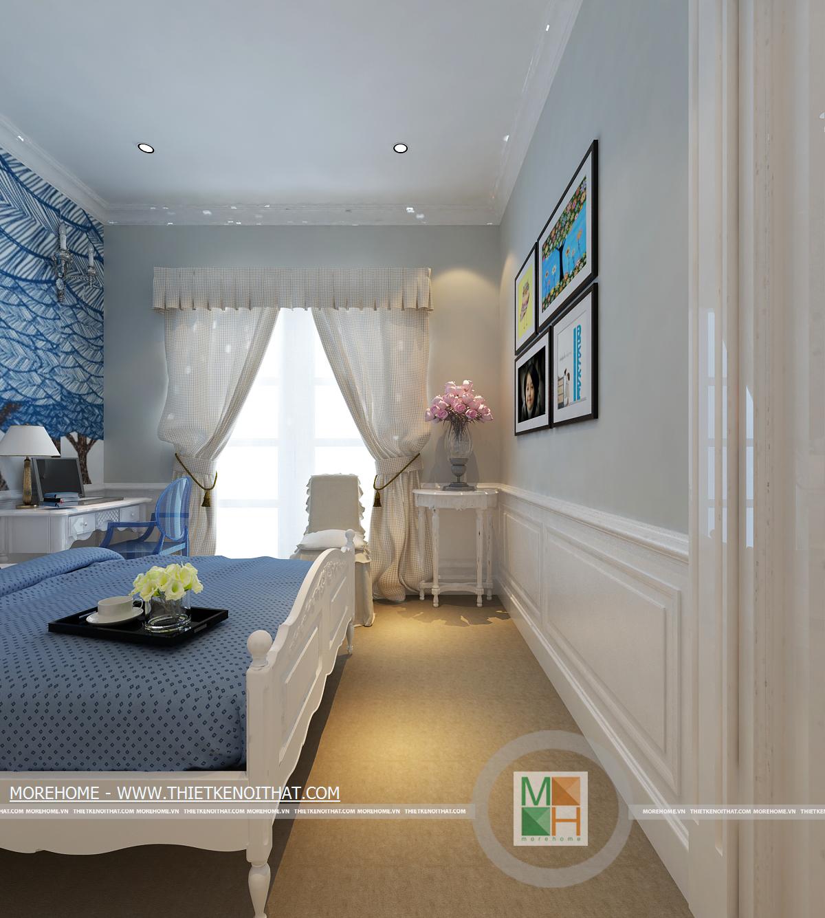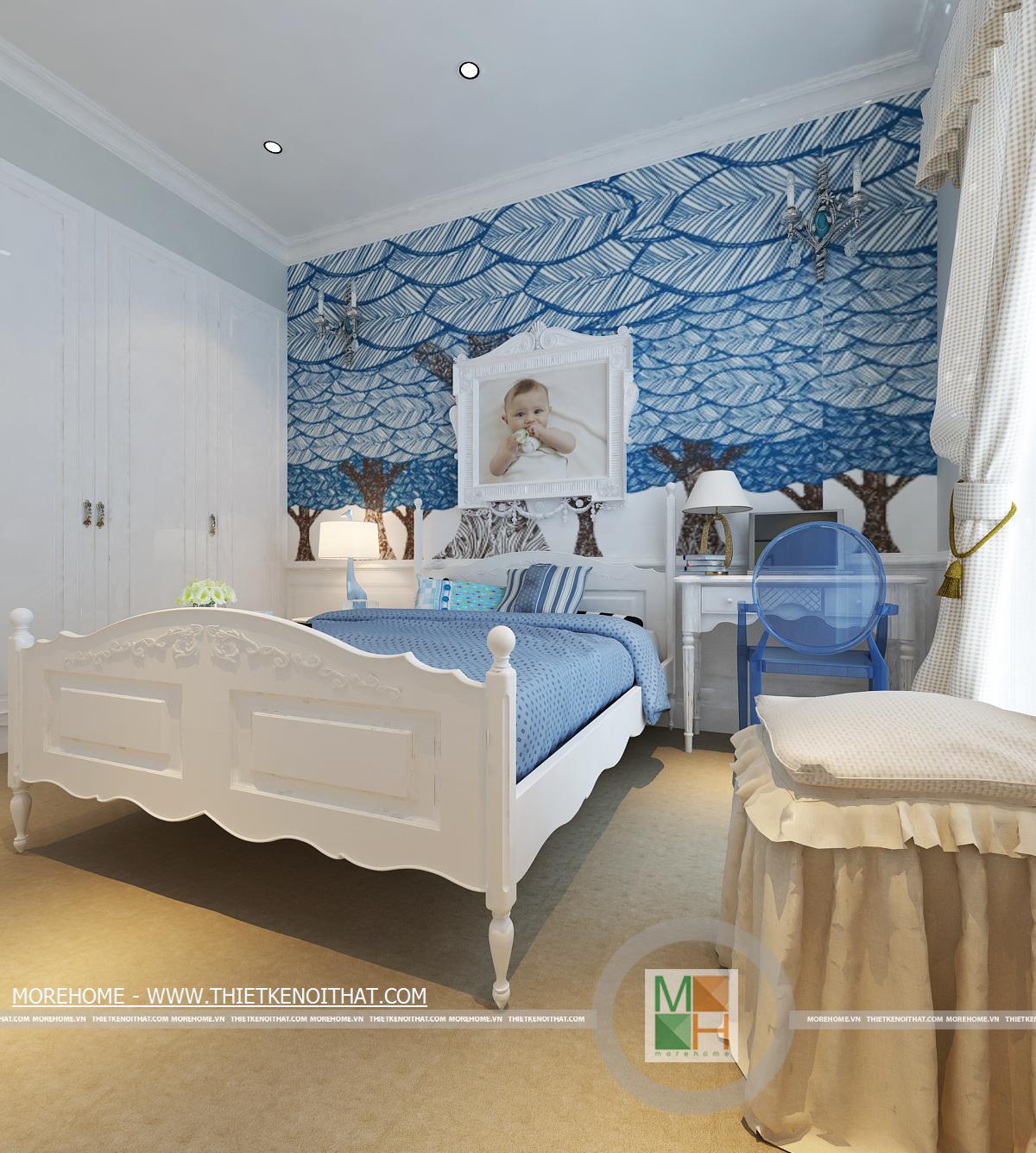 Phòng ngủ con trai trẻ trung hơn với tông màu xanh nước biển và những bức tranh tường năng động. Thảm trải sàn và giường mang phong cách tân cổ điển theo mô tuýp chung của tổng thể nhưng vẫn mang hơi hướng cá tính, sôi động phù hợp với lứa tuổi của con.