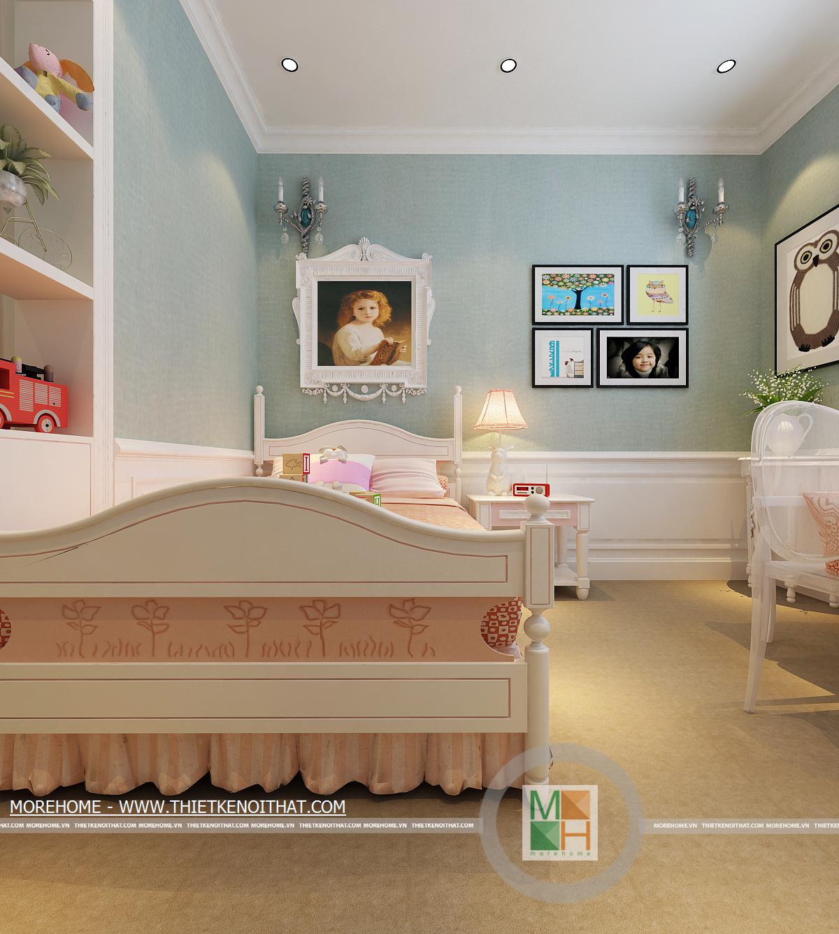 Phòng ngủ con gái thì sử dụng tông màu hồng nhạt với vách ngăn được kết hợp làm design và giá để đồ chơi. Góc học tập được kê sát cửa sổ với phần rèm cửa màu hồng cùng tông với màu căn phòng.