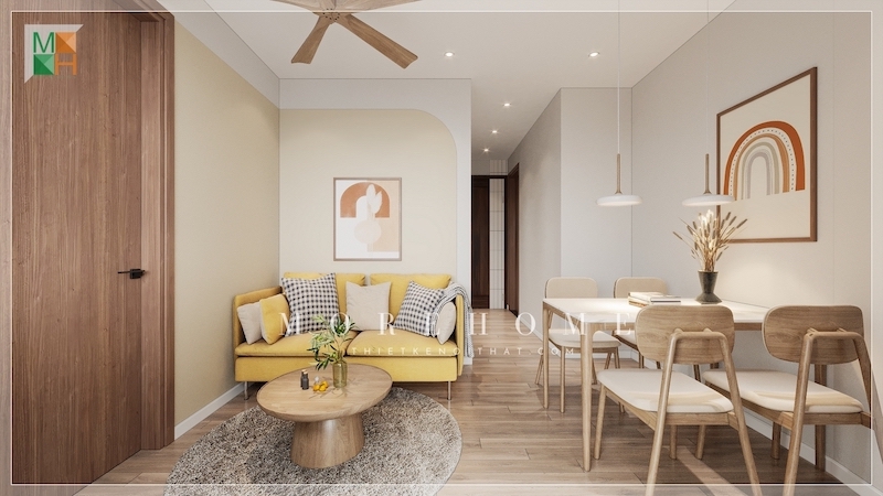 Phòng khách: Một mẫu thiết kế phòng khách gỗ công nghiệp đẹp là kết hợp giữa ghế sofa màu trắng và bàn trà gỗ sồi với chân kim loại. Các đồ trang trí như giỏ tre, đĩa đựng trái cây,.. sẽ tạo điểm nhấn cho không gian phòng khách.